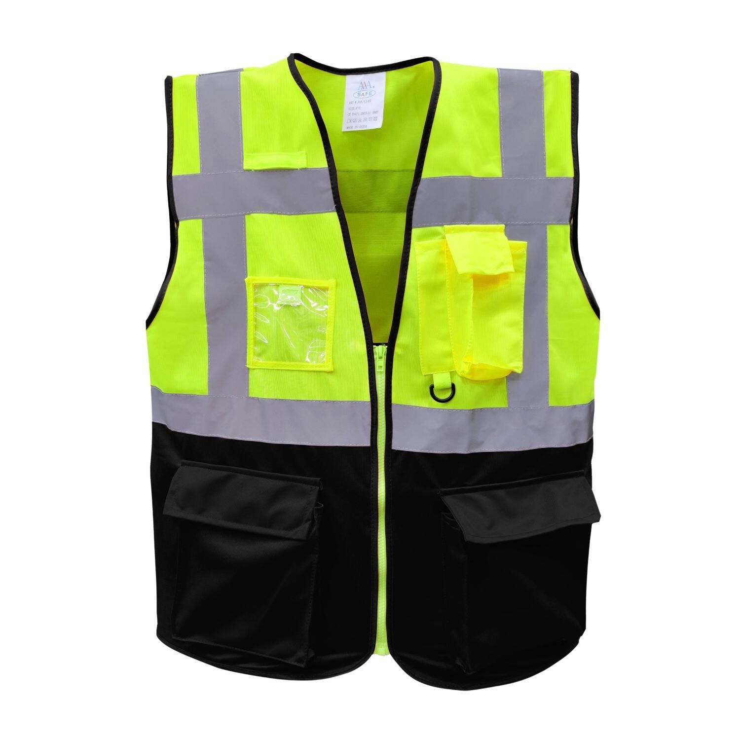 This description highlights a safety vest designed for both good visibility and some storage functionality.